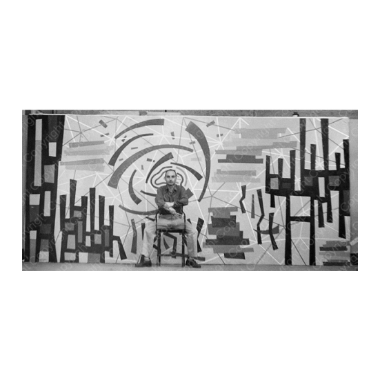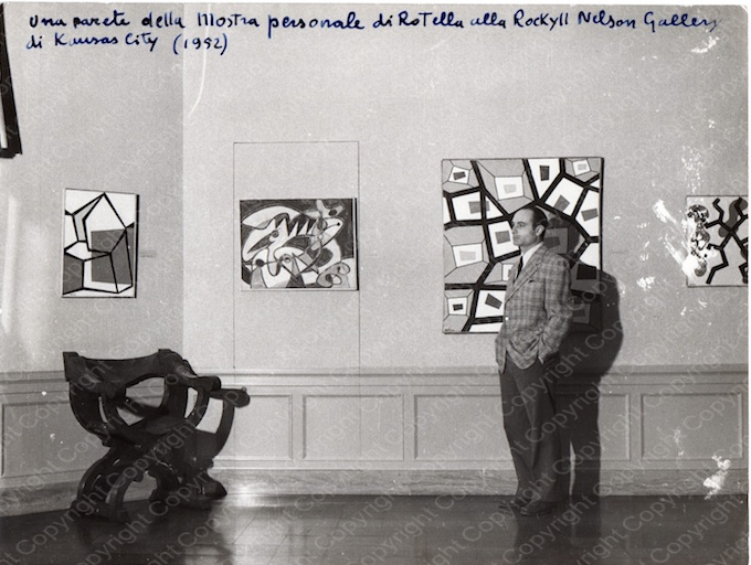 In September 1951, Rotella travelled to the United States, thanks to a Fulbright scholarship, which provided him with a stable position for about one year at the University of Kansas City. During this stay, the artist worked on a solo exhibition at the Rockhill Nelson Gallery of Art in Kansas City, and painted a large wall panel with an astronomical theme for the rooms of the Department of Geology and Physics at the University. Following his stay in the United States, he landed in Naples in August of 1952 and, after a time on Ischia, returned to Rome, where he began working in a studio in Via San Giacomo, devoting himself almost exclusively to poetry and music.